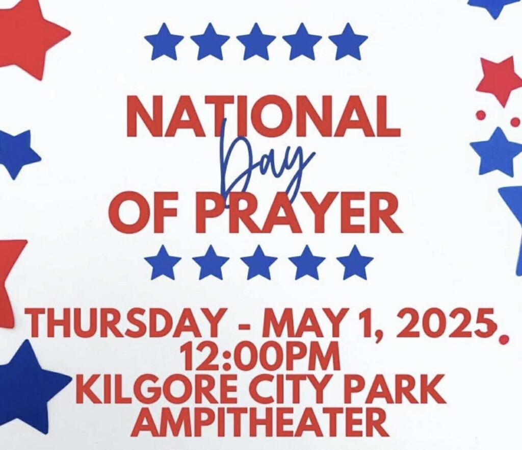 “No speakers, no music… just prayer!” Organizers of this year’s National Day of Prayer ceremony in thee City of Kilgore, Texas aim to keep it simple. The annual event’s set for noon Thursday, May 1, in the amphitheater at Kilgore City Park. Everyone is welcome, and prayer is the only item on the itinerary, according