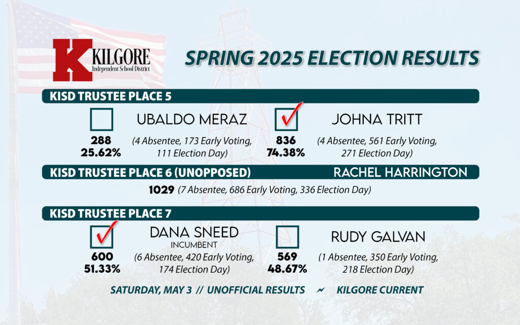 Kilgore Mayor Ronnie Spradlin secured another term by a narrow 18-vote margin (18 votes) Saturday following Election Day polling at Kilgore City Hall. At Kilgore ISD, incumbent Dana Sneed also retained his Place 7 seat on the school board with a 2.66 percent lead while Johna Tritt locked down Place 5 with 74.38 percent of