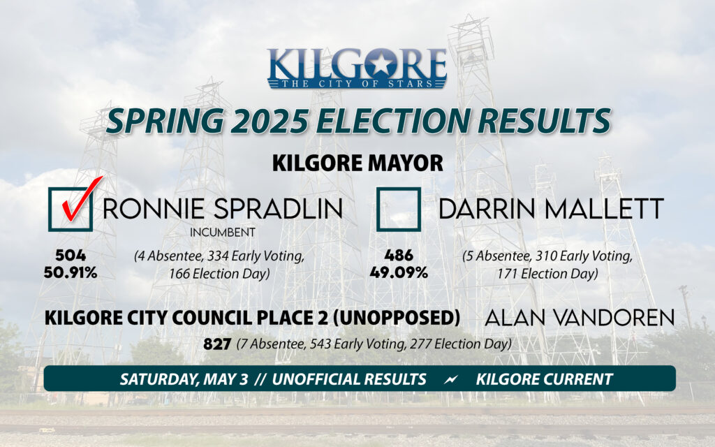 Incumbent Ronnie Spradlin has landed another term as Kilgore Mayor May 3, according to unofficial results released Saturday evening. Spradlin faced challenger Darrin Mallett in the Spring 2025 election cycle, earning 504 total votes to 486.The coming term will be Spradlin’s eighth full-stint in office. He was initially elected to finish out the second half