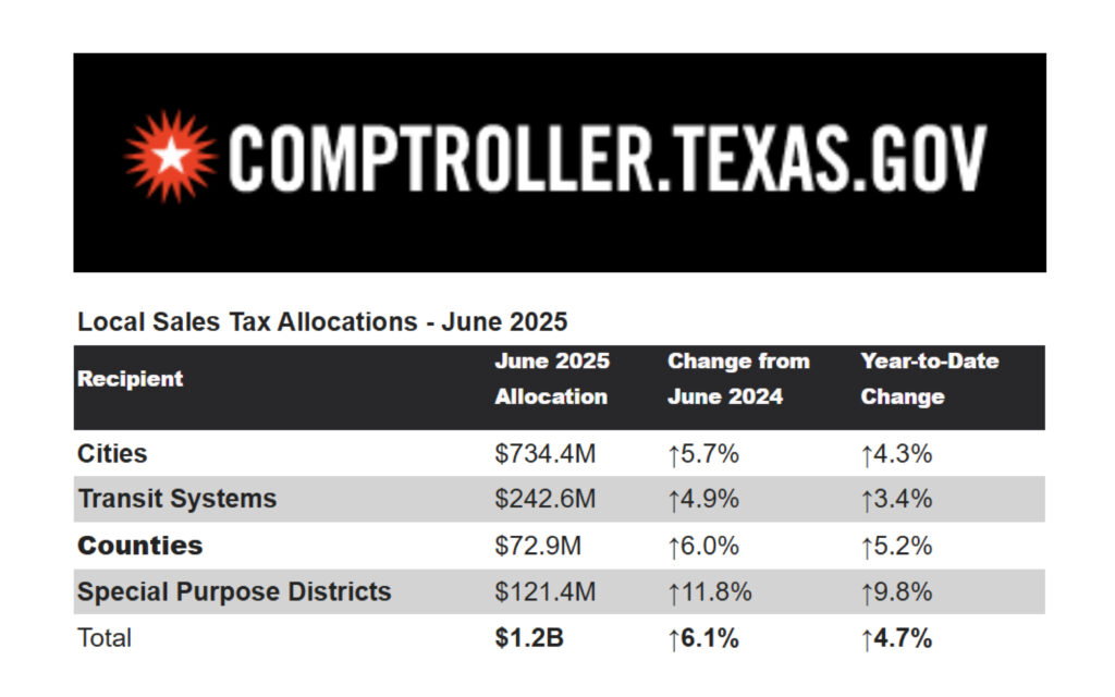 AUSTIN — Texas Comptroller Glenn Hegar announced today he will send cities, counties, transit systems and special purpose districts $1.2 billion in local sales tax allocations for June, 6.1 percent more than in June 2024. These allocations are based on sales made in April by businesses that report tax monthly. Local Sales Tax Allocations – […]