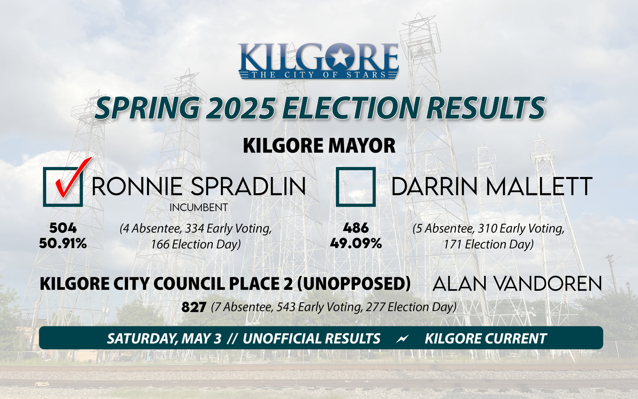 Incumbent Ronnie Spradlin has landed another term as Kilgore Mayor May 3, according to unofficial results released Saturday evening.
